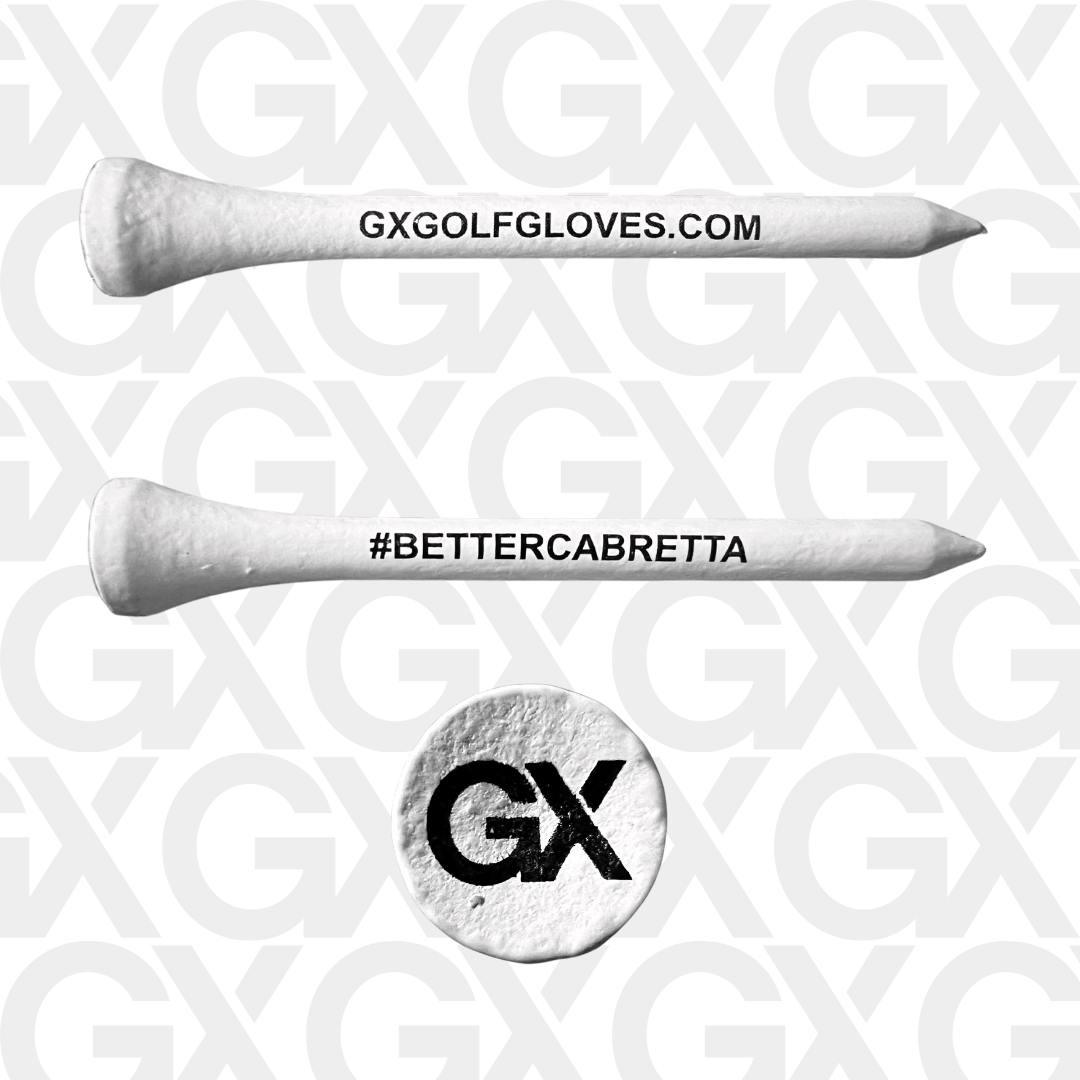 The GX Strong Wooden Tees are a 70mm tee with a considerable amount of increased durablility than the average golf tee due to the higher density of the wood used. All tees are painted white with the GX logo on the crown along with GXGolfGloves.com and our tag #BETTERCABRETTA featured on both sides.